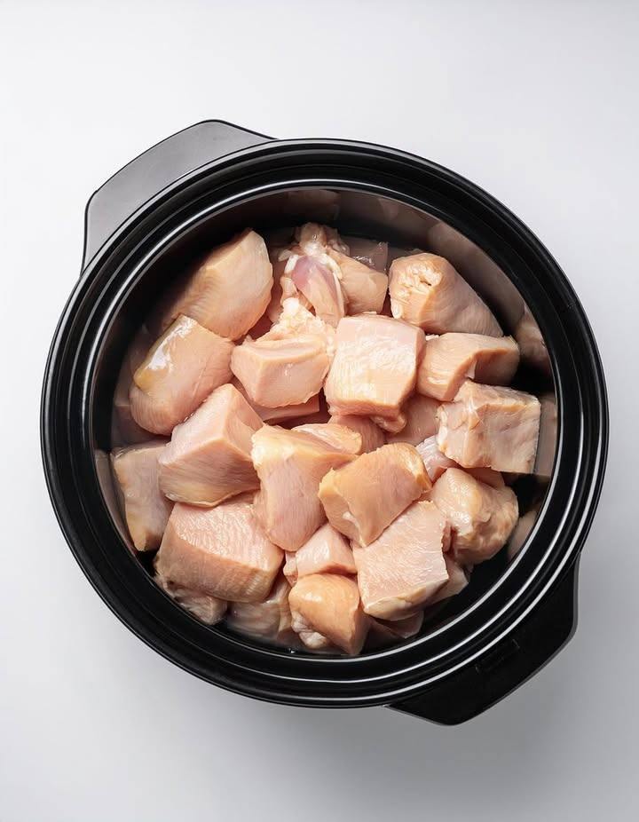 1. Place the cubed chicken breast in the bottom of your slow cooker.