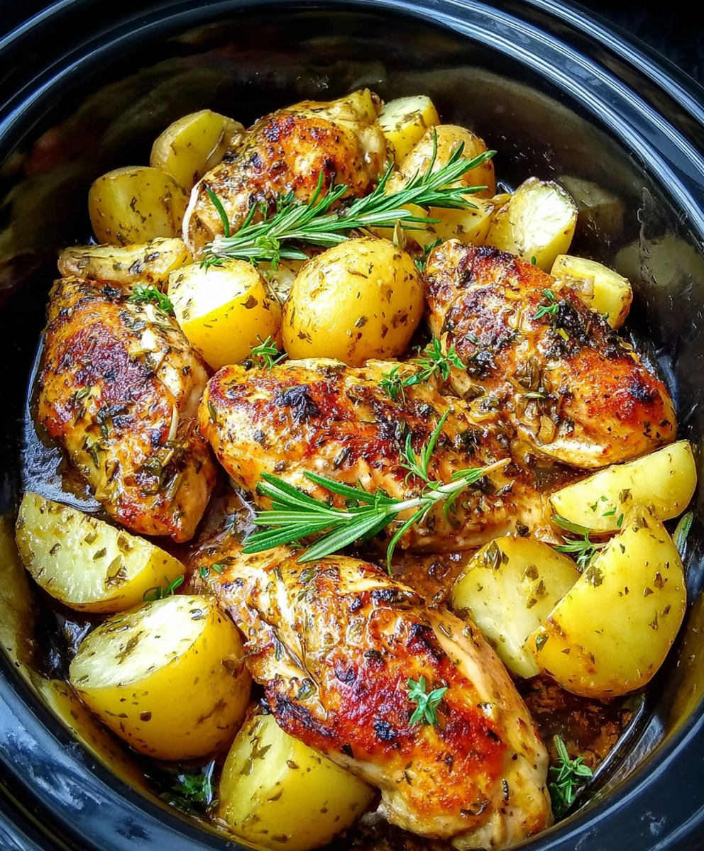 This Slow Cooker Herby Chicken and Potato Bake is my answer to those crazy busy days when you still want a proper home-cooked dinner! Juicy chicken nestled on top of golden potatoes, all infused with the most gorgeous herbs and practically cooking itself while you tackle everything else on your to-do list.